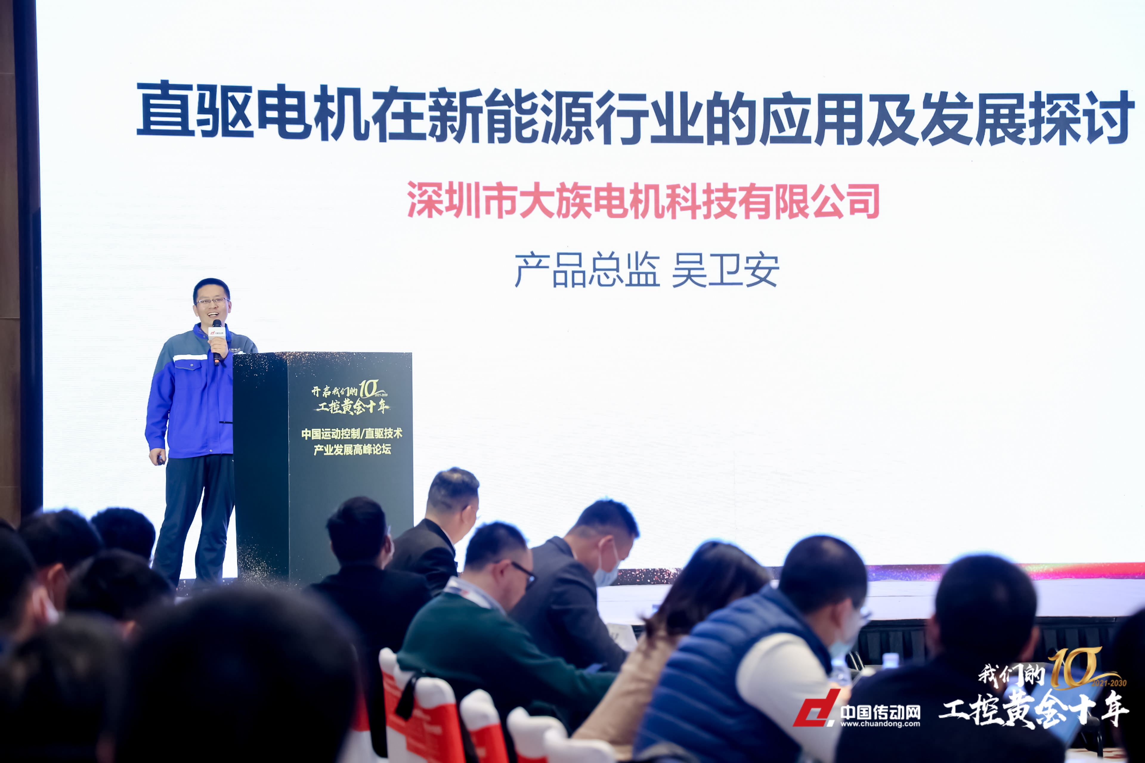 在直驅(qū)專場的分會上,大族電機產(chǎn)品總監(jiān)吳衛(wèi)安先生做了《直驅(qū)電機在新能源行業(yè)的應用及發(fā)展探討》的專題報告,他系統(tǒng)分析了直驅(qū)技術(shù)的發(fā)展趨勢,并與現(xiàn)場觀眾分享了大族電機在新能源行業(yè)的應用案例及核心技術(shù)產(chǎn)品。