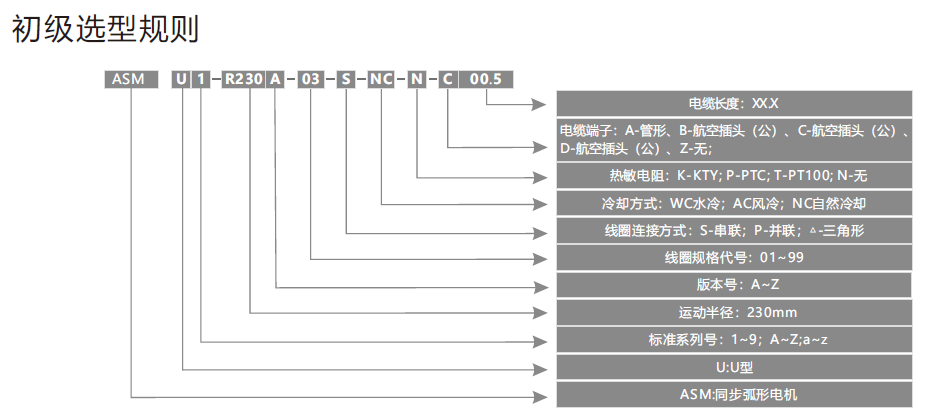 A S M U 1 - R 2 3 0 A - 0 3 - S - N C - N - C 0 0 . 5表示:同步弧形U型電機之第1個標準系列,運動半徑2 3 0 m m,A版自然冷卻,無熱敏電阻C類航空插頭線長0 . 5 m。
