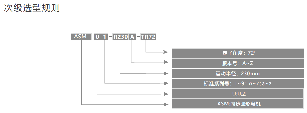 A S M U 1 - R 2 3 0 A - T R 7 2表示:同步弧形U型電機之第1個標準系列,運動半徑2 3 0 m m,A版本,定子角度72度。